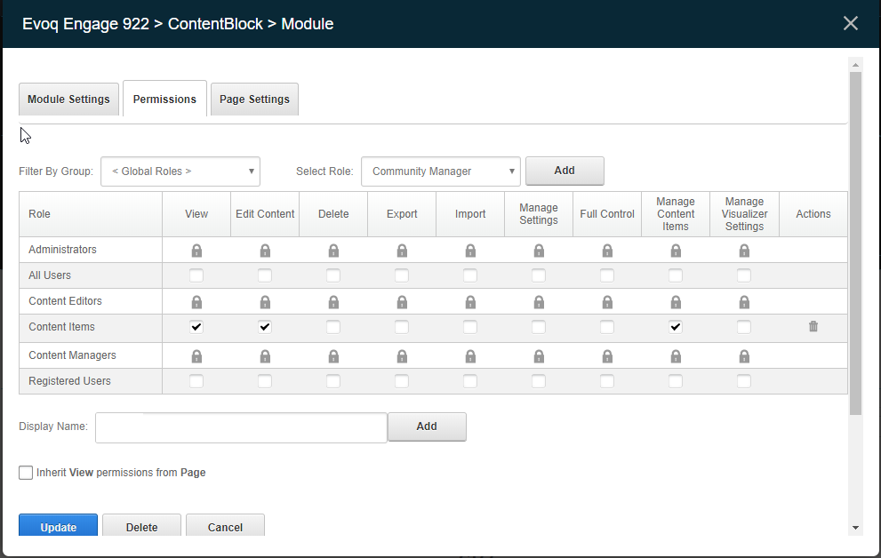 - Once the module is displaying the desired Content Items, you can edit the visualizer module permissions, and allow the custom role to "Edit Content" and "Manage Content Items". (See attached Screenshot).