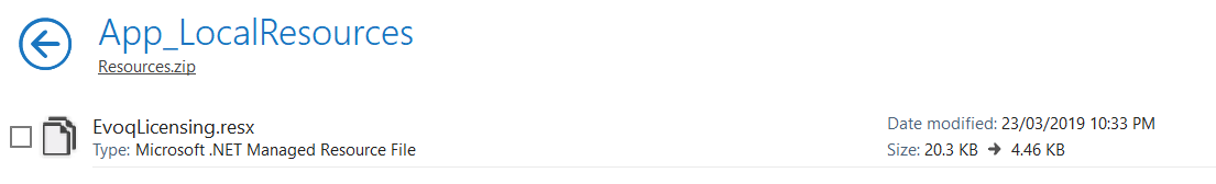 When you open the zipped resource file folder inside the Lincensing_01.07.00_install.zip, Navigate to Resources.zip > App_LocalResources and you should locate the EvoqLicensing.resx in there.